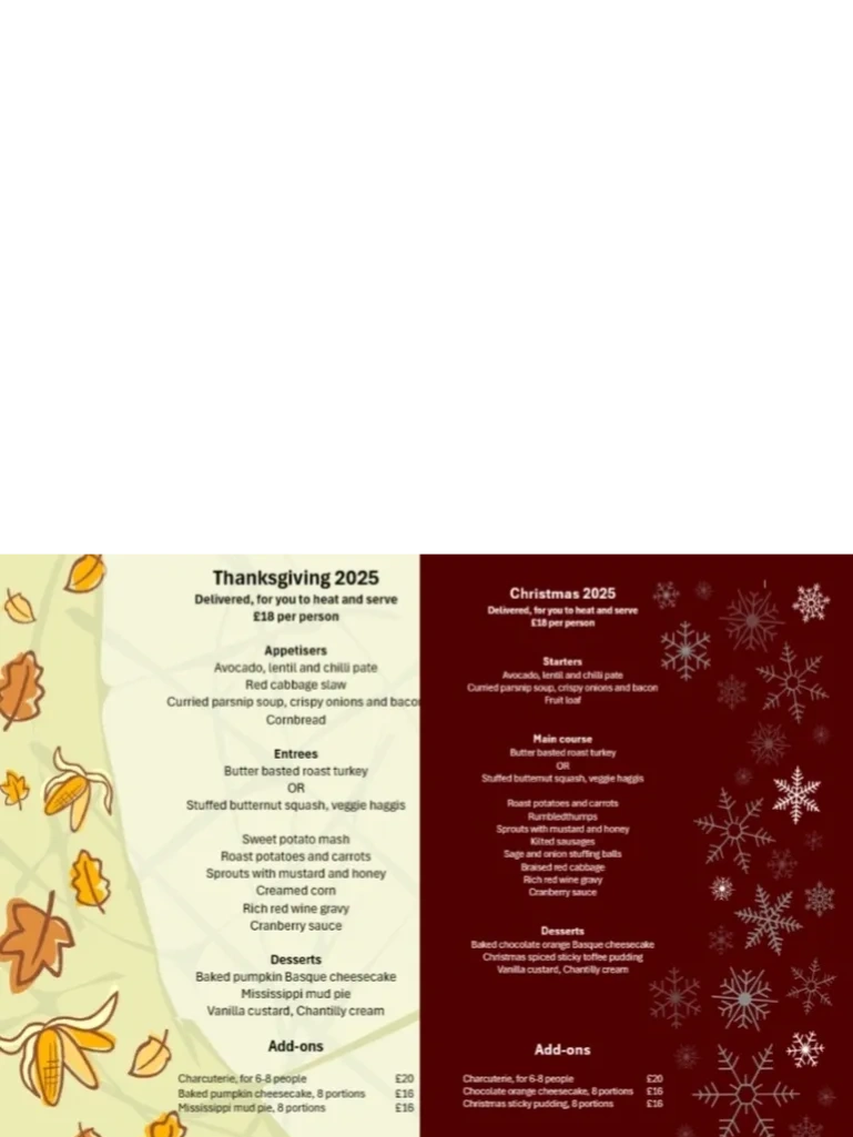 Red pepper fishcakes, butter basted turkey, creamed corn, pumpkin cheesecake, vegetarian options