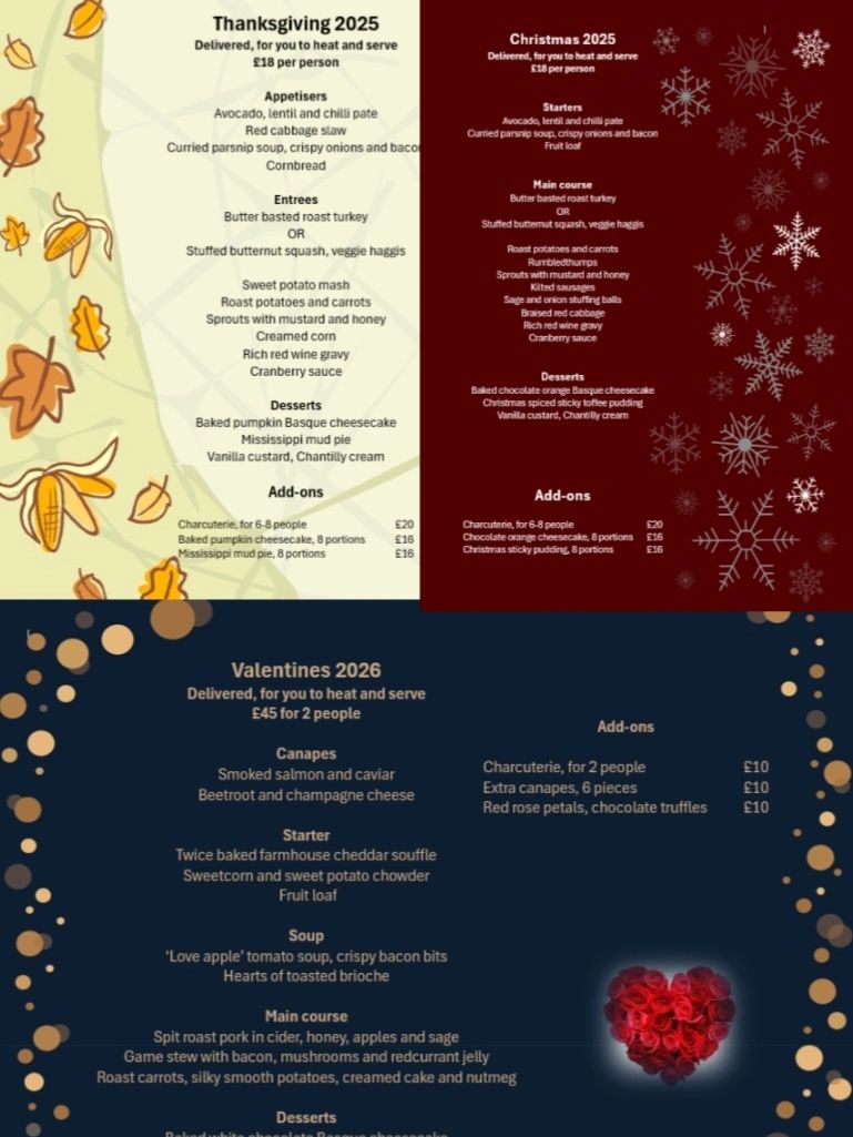 Red pepper fishcakes, butter basted turkey, creamed corn, pumpkin cheesecake, vegetarian options